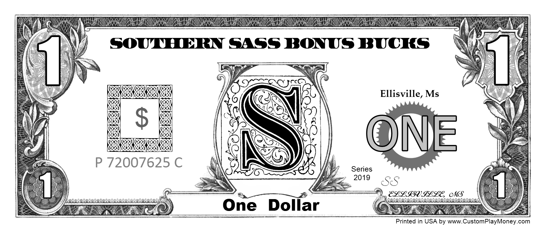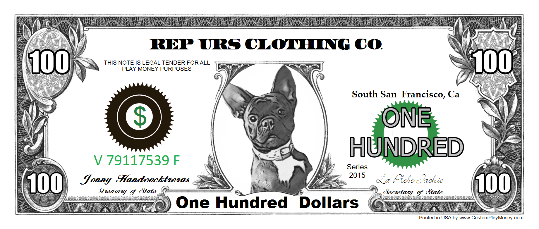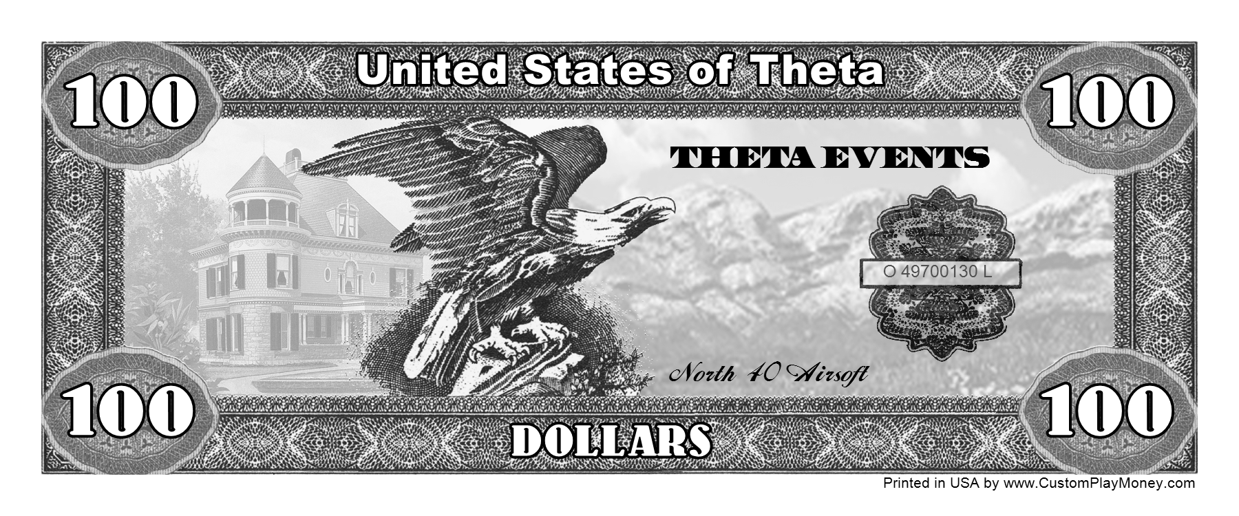 We support any world wide currency (or make your own up) for your play money items. Assigning the currency helps when placing denomination components on your item. When rendering the denomination amounts spelled out ... "One Hundred" for example, the proper denomination spelling will be automatically added to produce "One Hundred Dollars".